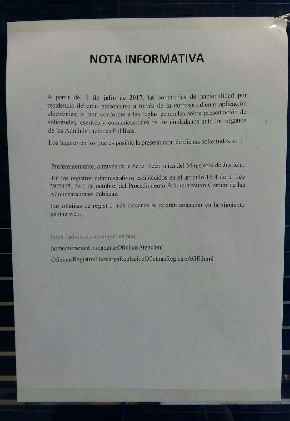- A partir del 1 de julio de 2017, las solicitudes de nacionalidad por residencia deberán presentarse a través de la correspondiente aplicación electrónica, o bien conforme a las reglas generales sobre presentación de solicitudes, escritos y comunicaciones de los ciudadanos ante los órganos de las Administraciones Públicas.