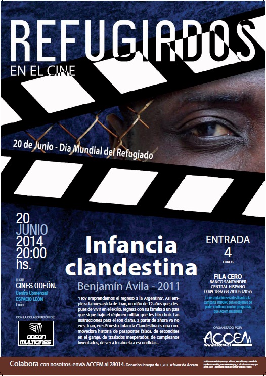 - Cine Solidario en León. Con motivo del Día Mundial del refugiado, Accem León organiza una proyección solidaria. Accem León- Semana del Refugiado (archivo asociado). El día 20 de junio se proyectará en los cines Odeón (Centro Comercial Espacio León) la película “Infancia Clandestina”. Esta iniciativa pretende conseguir fondos para poder continuar con el desarrollo de nuestros proyectos. El precio de la entrada será 4 euros. Para quien no pueda asistir pero esté interesado en colaborar se ha puesto en marcha una Fila Cero en Banco Santander Central Hispano 0049 1892 68 2810532056. Un Stand informativo de Accem estará instalado los días 18, 19 y 20 de Junio de 18:00 a 20:00 en el espacio solidario del Centro Comercial Espacio León. Participarán en el desarrollo de todas las actividades el equipo técnico de Accem, el equipo de voluntariado y otros colaboradores.