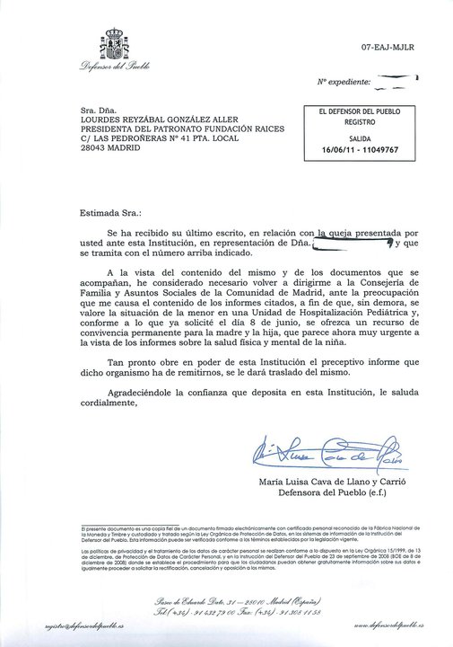 - Defensor del pueblo solicita al IMMF una valoración pediátrica y ratificando su recomendación de reunir a la familia (fichero asociado).